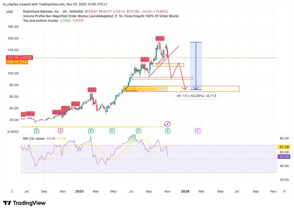 Actuellement à 127 dollars en pré-marché de ce vendredi, le HOOD reste sur une chute de plus de 10% sur la journée d’hier, à l’instar de Microstrategy qui chuté de 7%, ou encore CRCL qui a chuté de 11% également.