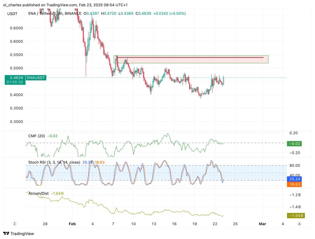 Par ailleurs, le 22 février, les liquidations de positions short se sont élevées à 250 040 $, tandis que celles de positions en long n’ont atteint que 176 860 $. En somme, les traders short sont contraints de couvrir leurs positions, exerçant ainsi une pression à la hausse sur le prix d’ENA.