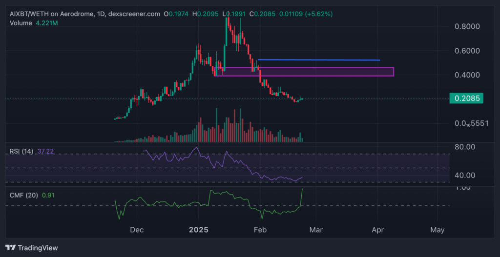 Aujourd’hui, AIXBT montre un fort rebond avec des volumes intéressants, mais surtout une explosion de son Chaikin Money Flow. À court terme, aixbt pourrait être l’agent IA à le mieux rebondir ce week-end.