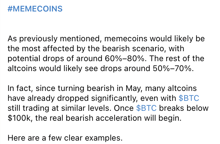 Les analystes crypto tirent la sonnette d’alarme. L’expert Crypto Capo a récemment averti que les altcoins plongent déjà, malgré le maintien de Bitcoin au-dessus de 100 000 $. Selon lui, les altcoins pourraient chuter de 50 à 70 %, voire plus pour certains memecoins, qui pourraient être les plus touchés avec des baisses allant jusqu’à 60-80 %.