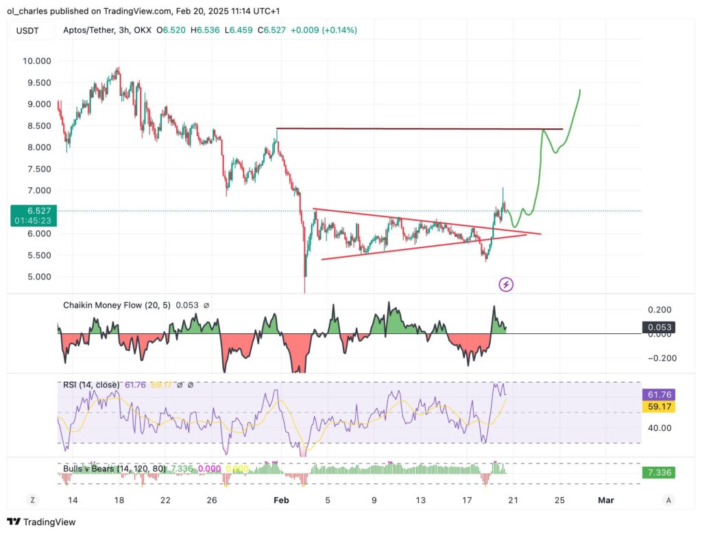 Le token natif APT de la blockchain Aptos a connu un rebond fracassant de 20% au cours des dernières 24 heures, porté par une viralité déchaînée sur les réseaux sociaux. Cet élan haussier a propulsé le prix du token à 6,45 $, son plus haut niveau depuis le 2 février dernier.