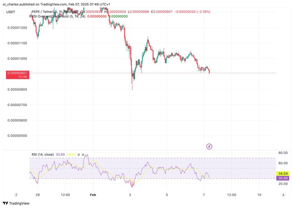 Après une hausse de 3% hier, le memecoin a de nouveau chuté de 13% jusqu’à 0,0000090 $ au moment de la rédaction. Le marché craint la chute du Bitcoin qui pourrait bien retomber à 92 000 dollars dans les prochaines heures.
