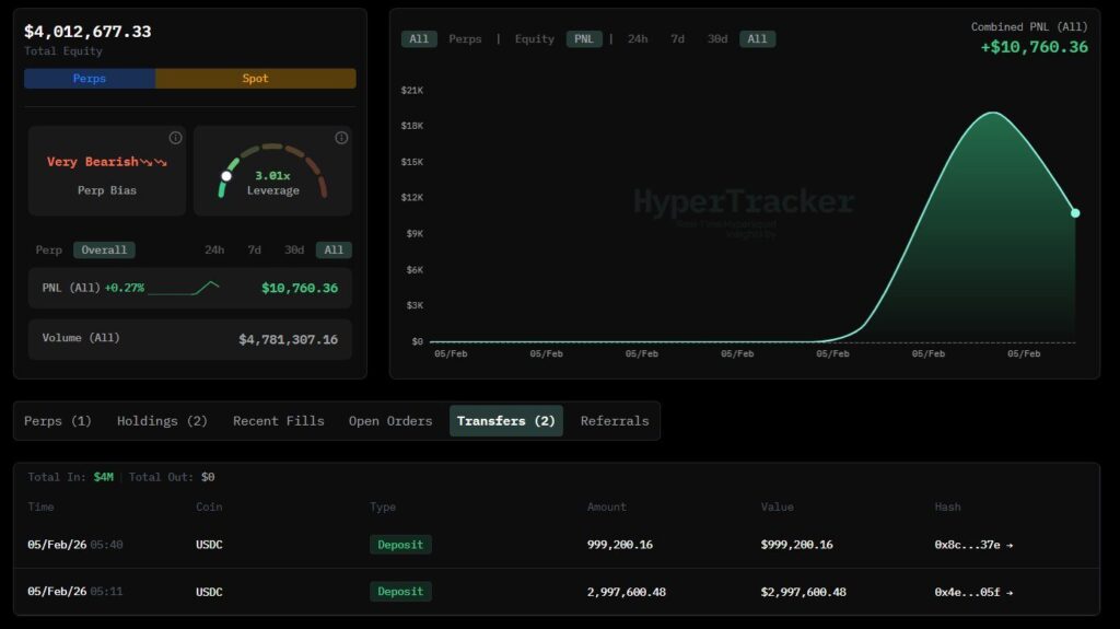 L’opération ne passe pas inaperçue. Un portefeuille nouvellement créé a déposé 4 millions de dollars en USDC sur Hyperliquid avant d’ouvrir immédiatement un short sur Solana avec un levier x3. Contrairement aux stratégies de couverture (hedging) habituelles, ce mouvement traduit une conviction baissière pure (naked short).