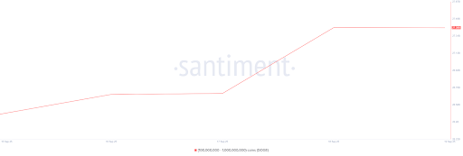 Selon les données de l’analytique on-chain de Sentiment, les portefeuilles détenant entre 100 millions et 1 milliard de DOGE ont considérablement renforcé leurs positions ces derniers jours. Leurs avoirs combinés sont passés de 26,48 milliards de DOGE le 15 septembre à 27,39 milliards le 19 septembre, soit une augmentation d’environ 910 millions de DOGE en seulement quatre jours. Cela représente plus de 250 millions de dollars au prix actuel du Dogecoin.