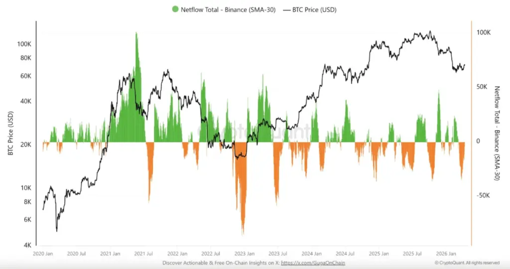 Le premier vient directement de Binance. Le flux net total sur la première plateforme mondiale affiche une moyenne de -1 350 BTC par jour, soit environ 96 millions de dollars qui quittent l’exchange quotidiennement. Quand le BTC sort de Binance en volume, il ne se vend pas : il s’accumule dans des portefeuilles qui n’ont aucune intention de le remettre sur le marché à court terme.