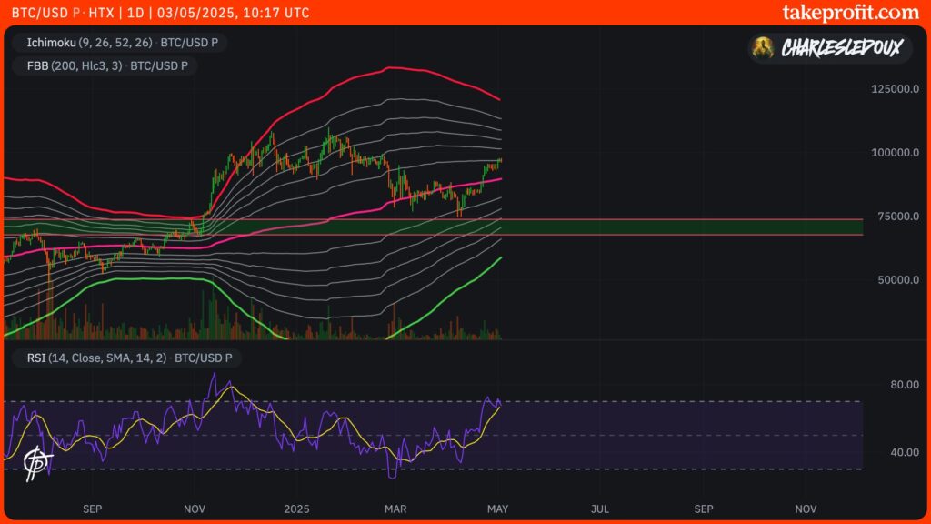 Le FBB journalier indique un scénario haussier jusqu’à 120 000 dollars et plus et 58 000 dollars et moins en cas de bear market. La divergence haussière du RSI en journalier est un autre indicateur en faveur des bulls.
