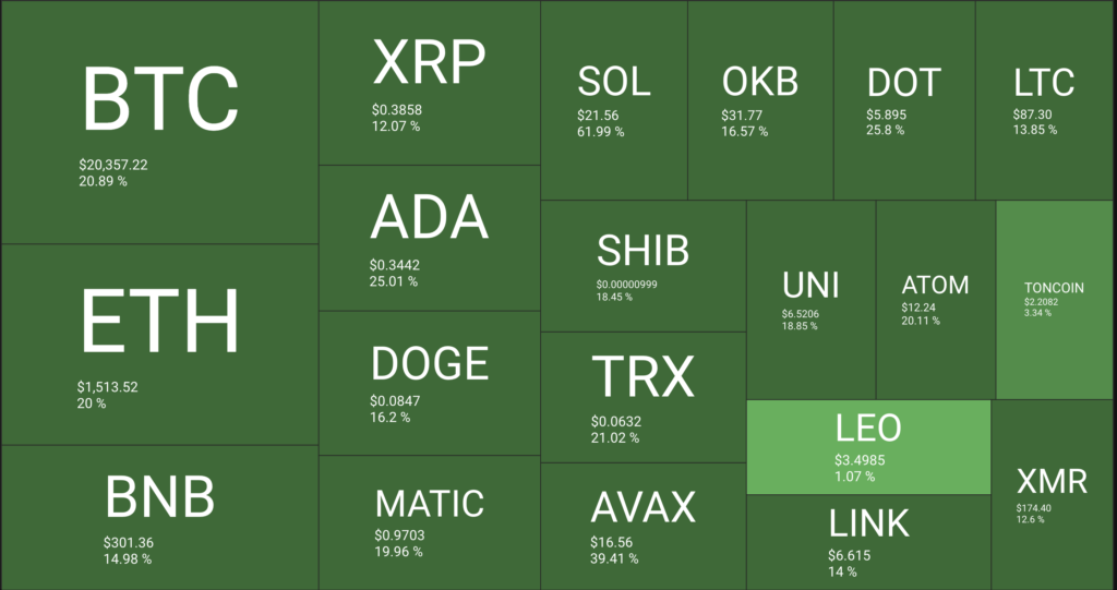 Alors que l’année 2022 a presque été brutale pour le marché des crypto-monnaies, 2023 semble redonner de l’espoir à la communauté crypto. Les prix des cryptos sont en vert cette semaine. Le cours du Roi des cryptos, le Bitcoin (BTC), a atteint un niveau record de 21 300 $ à 1h CET ce samedi matin, soit le plus haut niveau depuis le 6 novembre 2022. Les prix de BTC ont fluctué autour de 19 000 $ tout au long de la journée de vendredi avant de connaître une forte hausse à partir de 22h35 CET, juste après la clôture des marchés américains.
