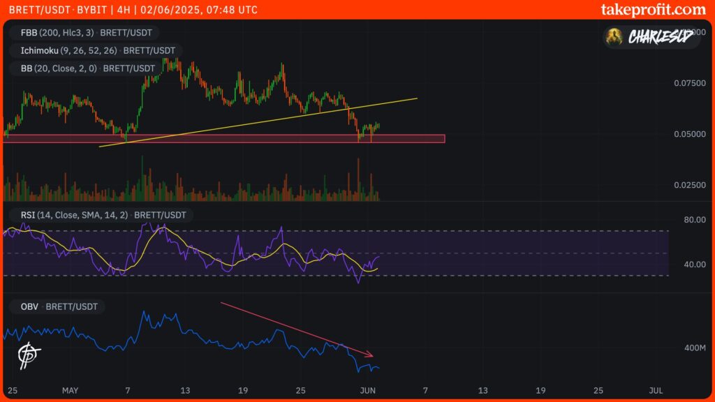 Malgré une structure de marché baissière sur le graphique 4 heures, le memecoin de la blockchain Base, BRETT, a réussi à défendre son niveau de support crucial de 0,051 $, établi début mai. Cette zone de demande pourrait bien être le tremplin d’un potentiel mouvement haussier à venir.