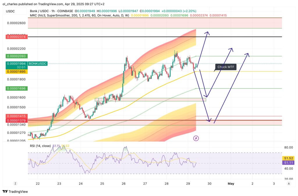 D’un point de vue technique, le 13 avril, BONK a cassé une ligne de tendance baissière, validant une sortie haussière. Le token a ensuite franchi les moyennes mobiles exponentielles (EMA) à 50 et 100 jours, confirmant l’inversion de tendance.