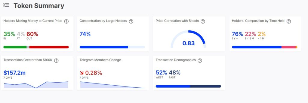 74 % du SHIB est contrôlé par des baleines, selon les données d’IntoTheBlock. La plupart des détenteurs (60 %) ont détenu pendant plus d’un an à perte, dans l’espoir d’un rebond des prix.