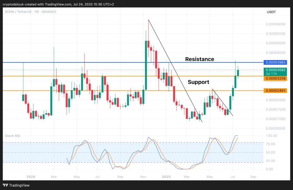 Alors que la majorité des cryptomonnaies affichent des performances négatives, le BONK fait figure d’exception en se maintenant au-dessus du support à 0,000032 $. Une fois que le marché aura renoué avec une tendance haussière, le BONK pourrait viser la résistance à 0,000039 $. Si les acheteurs parviennent à la franchir et à s’y maintenir, le plus haut historique deviendra alors accessible.