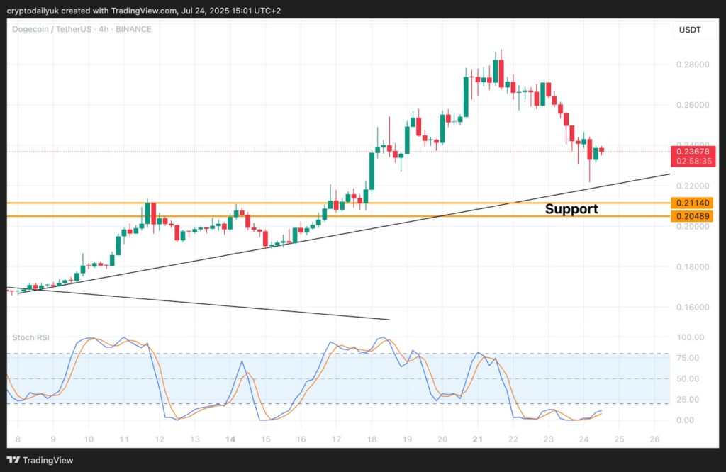 Selon l’analyse du graphique hebdomadaire, le DOGE a formé une série de nouveaux plus hauts et de nouveaux plus bas, suggérant que la tendance à la hausse va se poursuivre après cette récente correction. Le prix est revenu tester le support horizontal à 0,23 $, offrant une opportunité d’entrée intéressante pour les investisseurs.