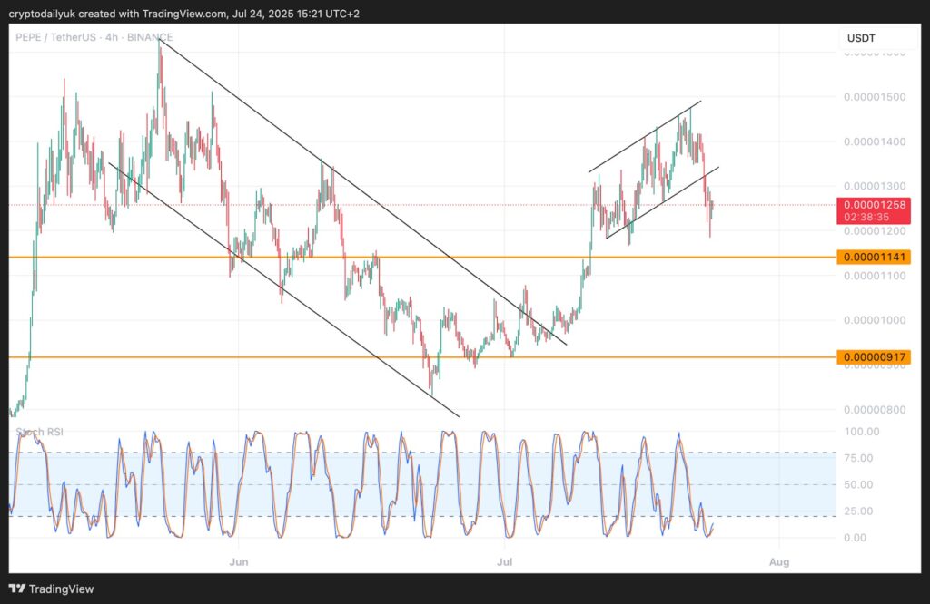 L’analyse du graphique hebdomadaire montre que le support à 0,000012 $ semble tenir bon. Un franchissement du plus haut local à 0,000016 $ pourrait ouvrir la voie à une nouvelle progression du PEPE.