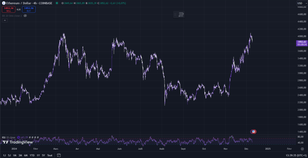 Au moment de la rédaction, Ethereum est valorisé à environ 3850 dollars, soit une baisse de 2% au cours des 24 dernières heures. La performance à plus long terme de l’altcoin est beaucoup plus remarquable, le prix d’Ethereum ayant progressé de plus de 10 % au cours des sept derniers jours.