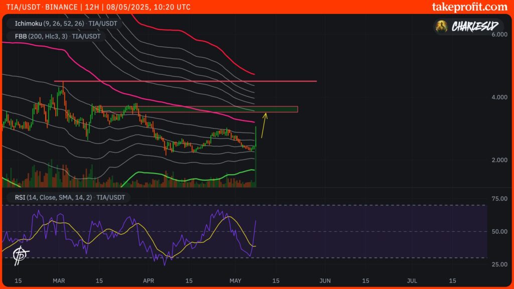 RSI (14 jours) : À 58 en 12H, TIA est encore en zone neutre, suggérant une possible opportunité d’achat, mais une prudence est de mise face à une éventuelle consolidation.