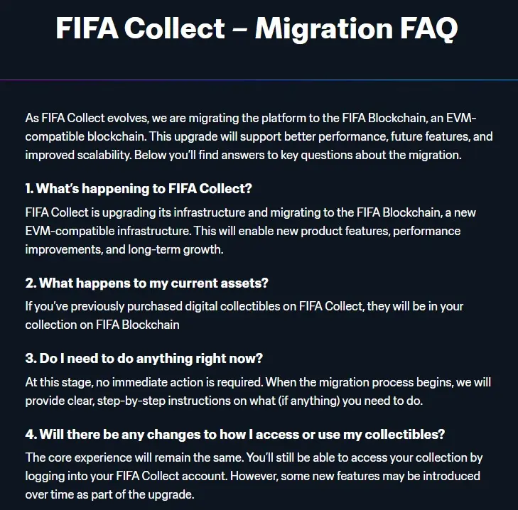 Actuellement hébergée sur la blockchain Algorand, la collection FIFA Collect va progressivement migrer vers cette nouvelle infrastructure EVM-compatible, à partir du 20 mai 2025 au plus tôt. Cette transition, transparente pour les utilisateurs, leur permettra de conserver leurs actifs numériques tout en bénéficiant de nouvelles fonctionnalités.