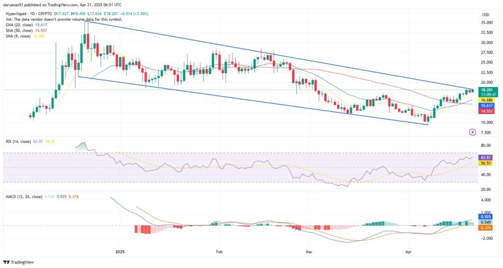 Après avoir atteint son plus haut historique de 35,02 dollars le 21 décembre dernier, le prix de HYPE a entamé une tendance baissière, formant une figure technique appelée « coin en baisse ». Mais aujourd’hui, les choses semblent changer.