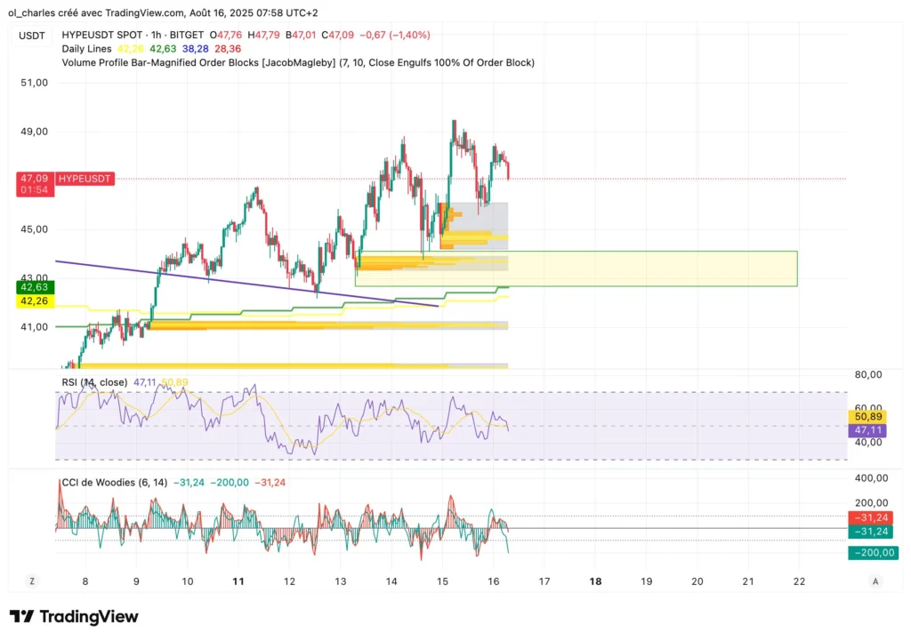 Si le support à 42,24$ tient bon, Hyperliquid est bien positionné pour tester et potentiellement dépasser son précédent record historique à 49,86$. Une cassure confirmée, accompagnée d’une expansion du volume, pourrait déclencher une accélération vers des niveaux encore inexplorés. Il sera crucial de surveiller le comportement du profil de volume lors de cette percée haussière.