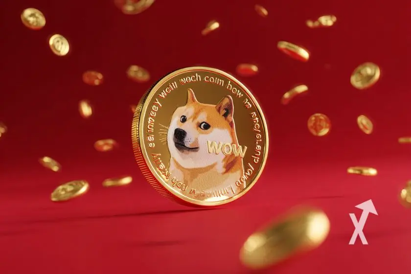 coin 3D du dogecoin avec pleins de coins dans le décor sur un fond rouge