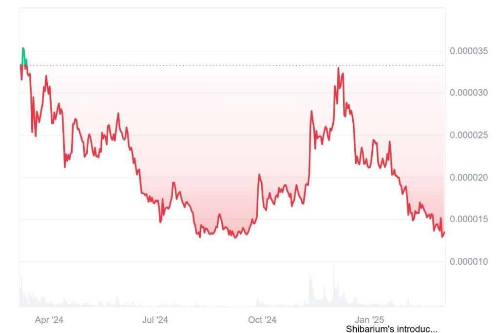 En mars 2025, Shiba Inu (SHIB) s’échange autour de 0,00001342 $, reflétant une période de volatilité au cours des derniers mois. Le token SHIB affiche une baisse de 14 % sur le dernier mois.