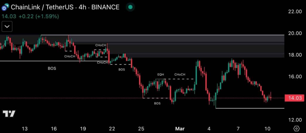 L’analyse technique de la tendance à court terme de LINK montre une succession de changements de caractère (CHoCH) et de ruptures de structure (BOS), indiquant une évolution de la dynamique du marché. Après avoir atteint un plus haut autour de 20 $, Chainlink a connu plusieurs points de résistance à 18 $, 16 $ et 14 $, confirmant l’affaiblissement de la force haussière.