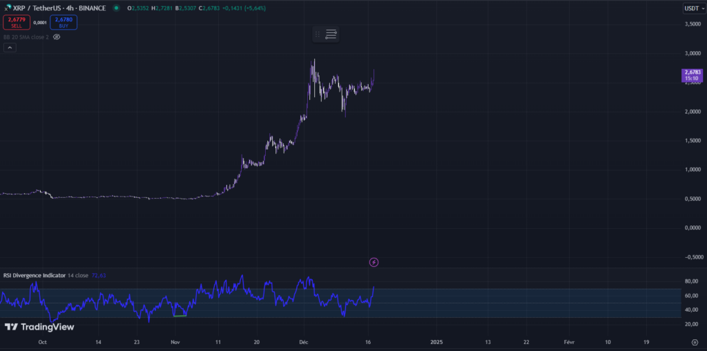 Au-delà du lancement de la RLUSD, le cours du XRP semble également soutenu par un signal technique haussier. En effet, XRP a validé un modèle de bull flag le 16 décembre, franchissant avec succès la résistance à 2,41$. Le prochain objectif est désormais la zone de 2,80$, puis les plus hauts historiques à 2,90$ et 3$.