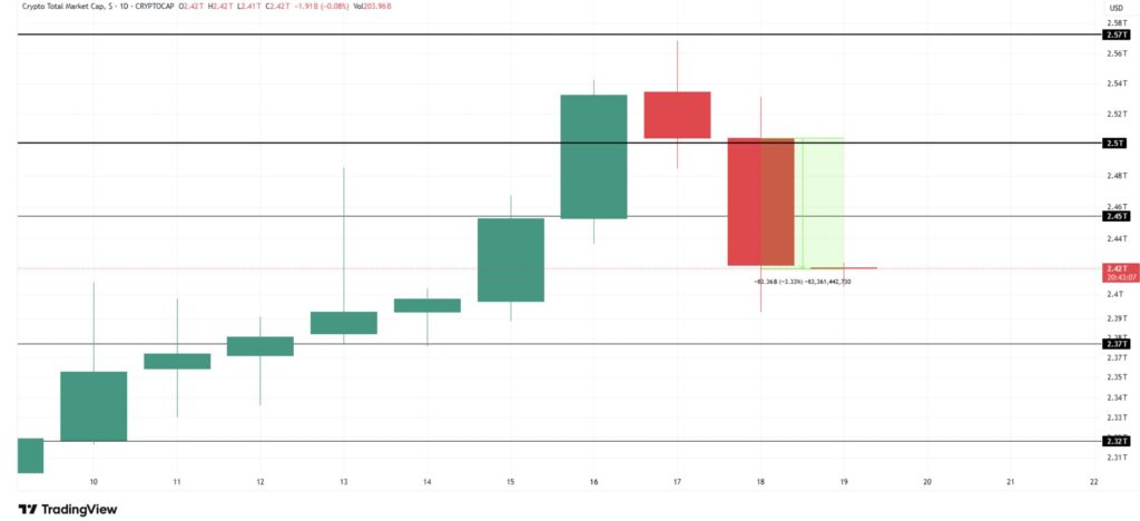 Cette donnée a déclenché un mouvement brutal sur les actifs à risque. La capitalisation globale du marché crypto a chuté de plus de 150 milliards de dollars en quelques heures, passant de 2 600 à 2 450 milliards. Les anticipations de baisse des taux par la Fed s’éloignent, renforçant un sentiment clairement bearish.