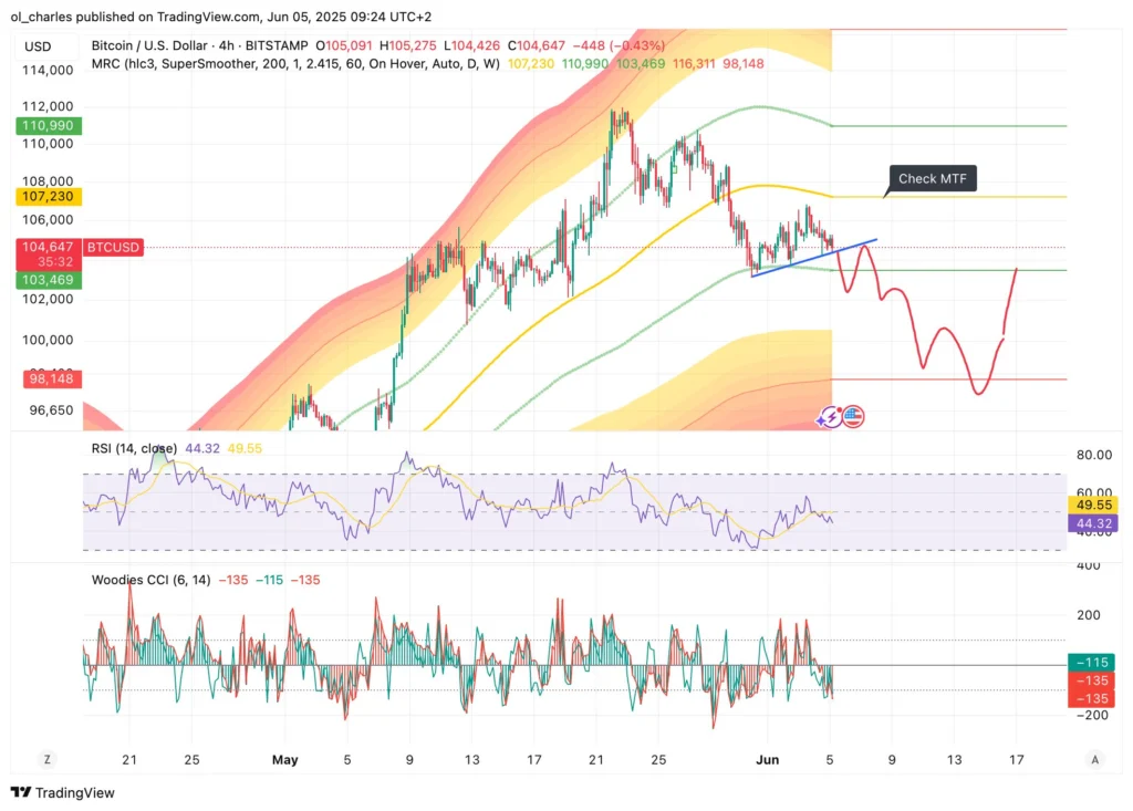 Le Bitcoin a formé une trendline haussière qui pourrait être liquidée prochainement, confortant les probabilités d’une chute à 102 600 dollars. Il faudra donc surveiller un rebond et la résistance de 104 900 dollars dans les jours qui suivent si ce scénario prend place. S’il ne parvient pas à reconquérir les 105 000 dollars, il ira plus bas, sous les 100 000 dollars.