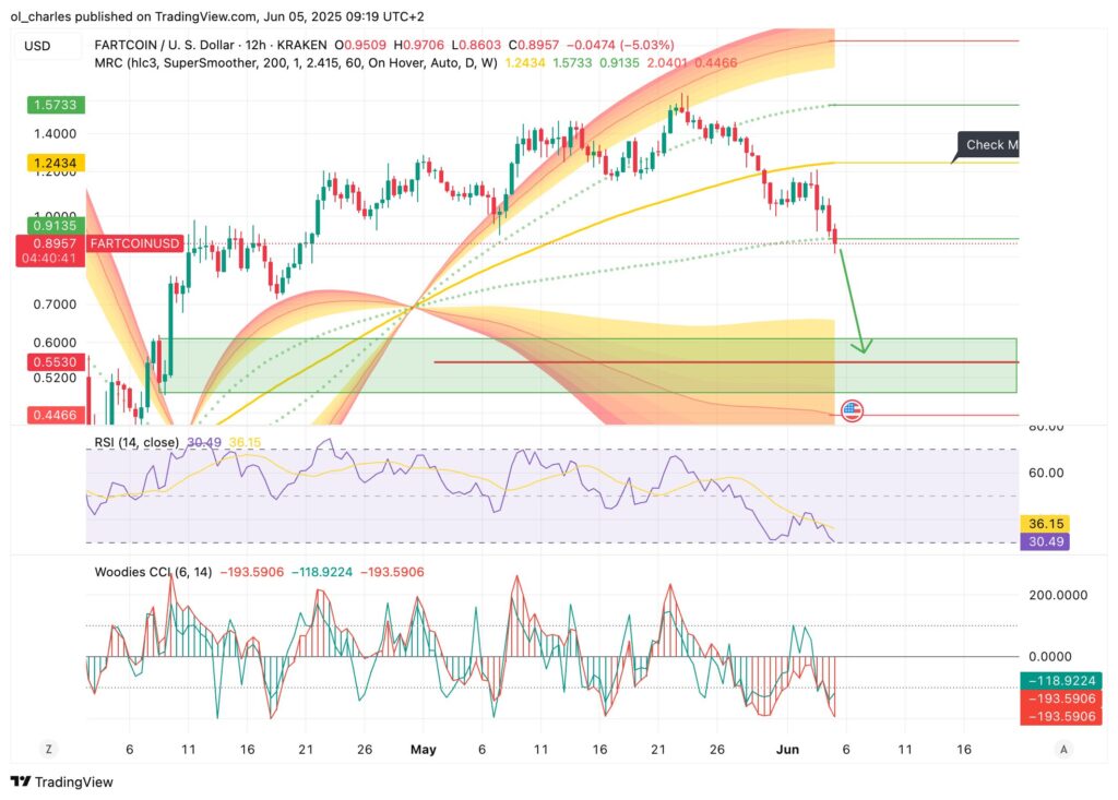 Selon le MRC en 12H, le FARTCOIN pourrait chuter jusqu’à la bande inférieure et la zone de demande à 0,5 dollar dans les semaines à venir.