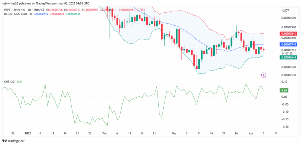 Les indicateurs techniques du marché, tels que les bandes de Bollingeret le flux monétaire de Chaikin, soulignent cette pression baissière potentielle. Le flux monétaire de Chaikin reste dans la zone positive. Pour autant, son mouvement vers le bas indique une phase de distribution en cours. Cela suggère que la baisse de PEPE pourrait être modérée avant un rebond important au niveau de support.