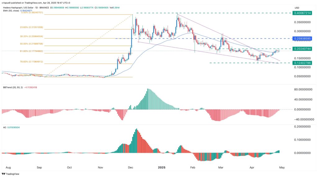 D’un point de vue technique, le HBAR affiche une configuration haussière classique. Après avoir formé un wedge descendant, le token a cassé à la hausse, franchissant la moyenne mobile exponentielle à 50 jours.