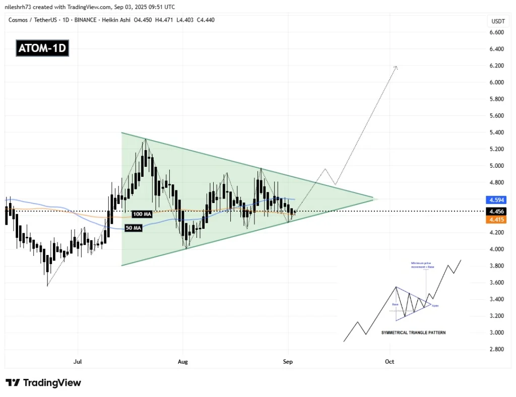 Aujourd’hui, ATOM évolue dans le vert, et surtout, son graphique présente désormais une formation de motif clé qui laisse entrevoir une potentielle percée dans les sessions à venir. Sur le graphique journalier, ATOM dessine en effet un motif de Triangle Symétrique, une structure souvent considérée comme un signal de continuation, bien qu’elle puisse se briser dans n’importe quelle direction selon la dynamique du marché.