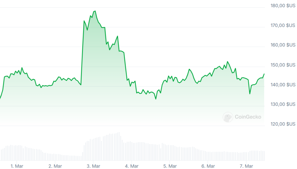 Cette dynamique positive a été de courte durée, car une correction brutale le 4 mars l’a ramené aux alentours de 140 $. On pourrait l’expliquer par des prises de bénéfices et à une résistance à des niveaux plus élevés. Depuis, Solana a montré des signes de reprise, rebondissant au-dessus de 150 $. Ce niveau pourrait désormais servir de nouveau support.