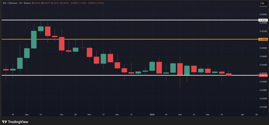 C’est là que l’analyse devient concrète pour les traders. Depuis sa chute sous les 0,05 après le crash d’octobre dernier, le ratio SOL/ETH peine à reconquérir ce niveau psychologique. Toutefois, sur le timeframe hebdomadaire, ce ratio n’a jamais clôturé sous la zone des 0,04, renforçant la solidité de ce support.