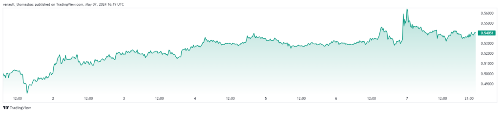 Le cours du XRP s’échange actuellement à 0,53$ et affiche un rebond au niveau de la ligne de support située à 0,51$. Pour conserver son élan haussier, XRP doit franchir les résistances à 0,57$ et 0,62$. Actuellement, il est en hausse de 7,5% sur les sept derniers jours.