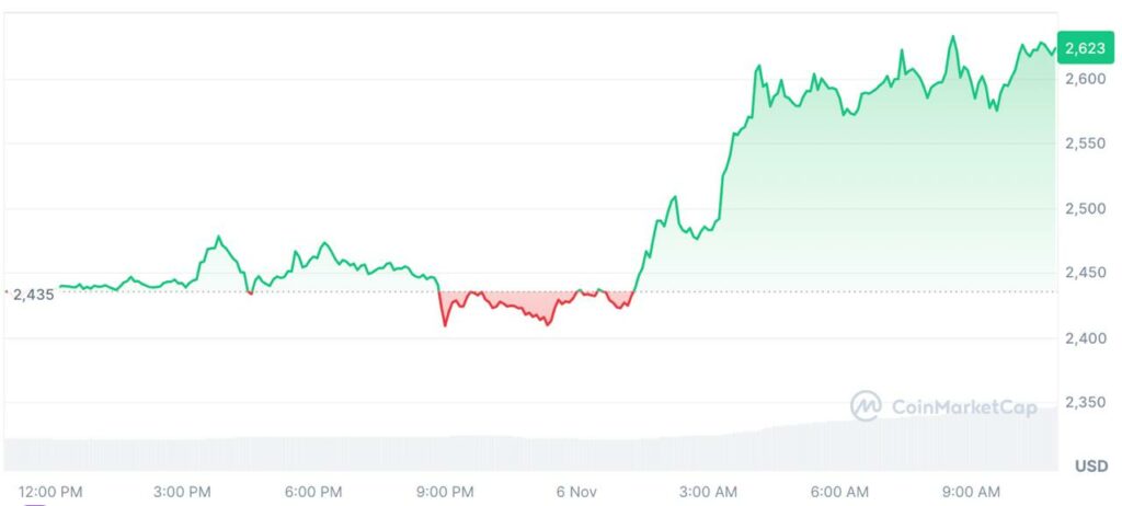 Au 6 novembre 2024, le cours de l’Ethereum (ETH) s’établit à 2 624 $. Ce niveau de prix représente une opportunité stratégique pour les investisseurs anticipant une progression vers la barre des 3 000 $.