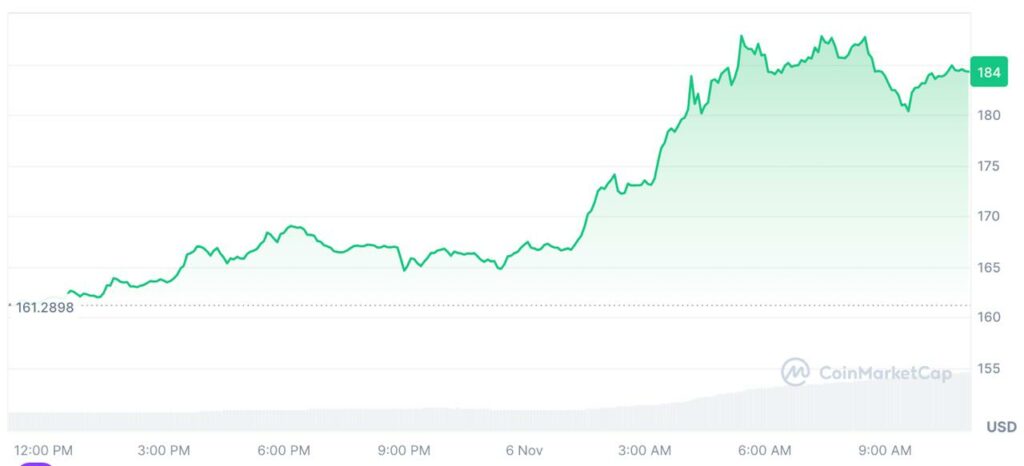 Aujourd’hui, le cours de Solana (SOL) est de 183,82 $, enregistrant une hausse de 13,88 % par rapport à la clôture précédente. Le prix intrajournalier a atteint un maximum de 187,90 $ et un minimum de 161,22 $