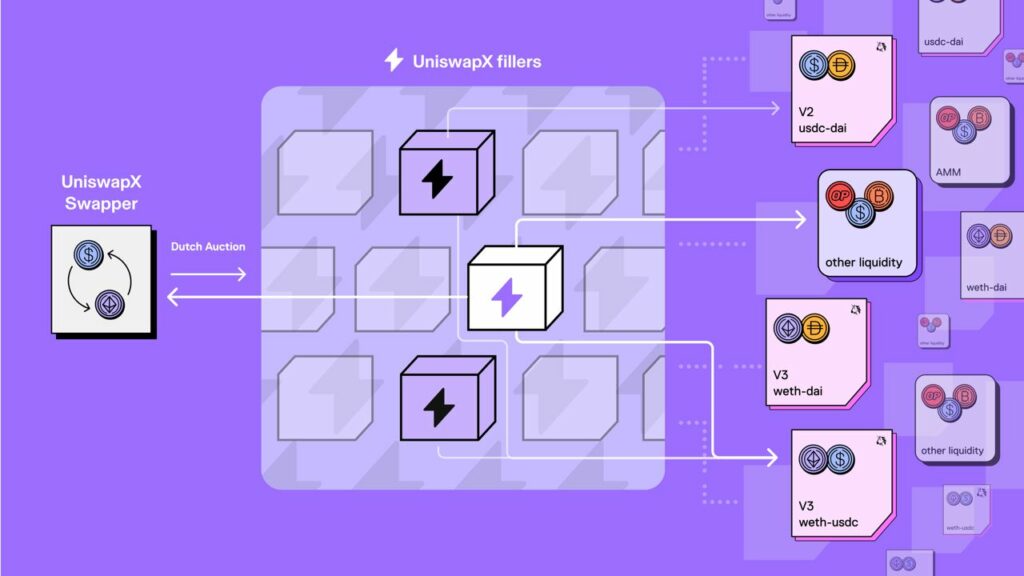 UniswapX a pour objectif de résoudre le problème récurrent de l’assèchement des pools de liquidité dans les bourses décentralisées. Pour ce faire, il collabore avec des « fillers » tiers qui effectuent directement des swaps ou orientent les utilisateurs vers des pools de market makers automatisés (AMM) adaptés.
