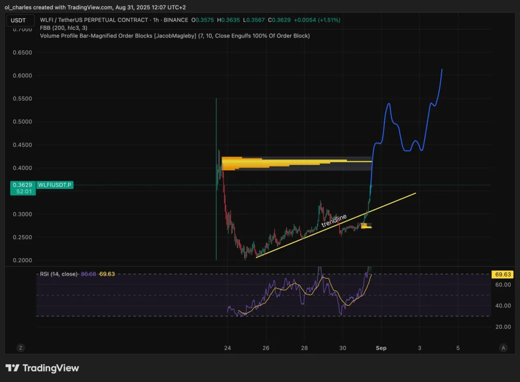 Sur le graphique 4H, le token WLFI présente un motif de coin élargissant ascendant, souvent considéré comme baissier, mais pouvant aussi entraîner des cassures à la hausse lorsque la dynamique est forte. Le rebond récent à partir de la ligne de support inférieure proche de 0,26 $ a fait grimper le prix au-dessus de 0,359 $, signalant la formation d’un plus haut plus élevé.