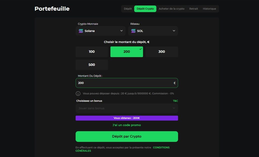 Si vous optez pour un dépôt crypto, double-vérifiez l’adresse de portefeuille avant de confirmer la transaction, car toute erreur rendrait les fonds irrécupérables.