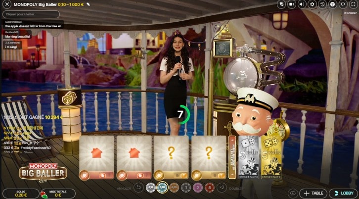 L’originalité de Monopoly Big Baller Casino réside dans son ambiance immersive de croisière fluviale. Un présentateur dynamique orchestre les tirages depuis un studio sophistiqué. La réalité augmentée intègre M. Monopoly dans l’environnement, créant une connexion visuelle saisissante entre le monde réel et virtuel.