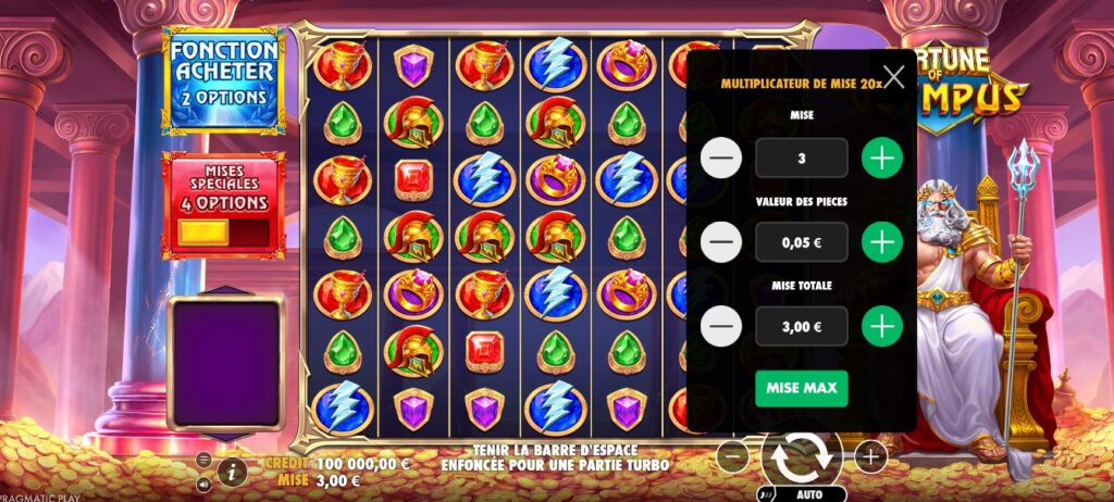 La démo Fortune of Olympus est disponible sur les meilleurs casinos crypto et casinos en ligne partenaires de Pragmatic Play. Ce mode permet de tester le jeu sans risque, avec un solde virtuel pour découvrir les multiplicateurs et les bonus. Certains sites exigent la création d’un compte, mais aucun dépôt n’est nécessaire pour lancer les premiers spins.