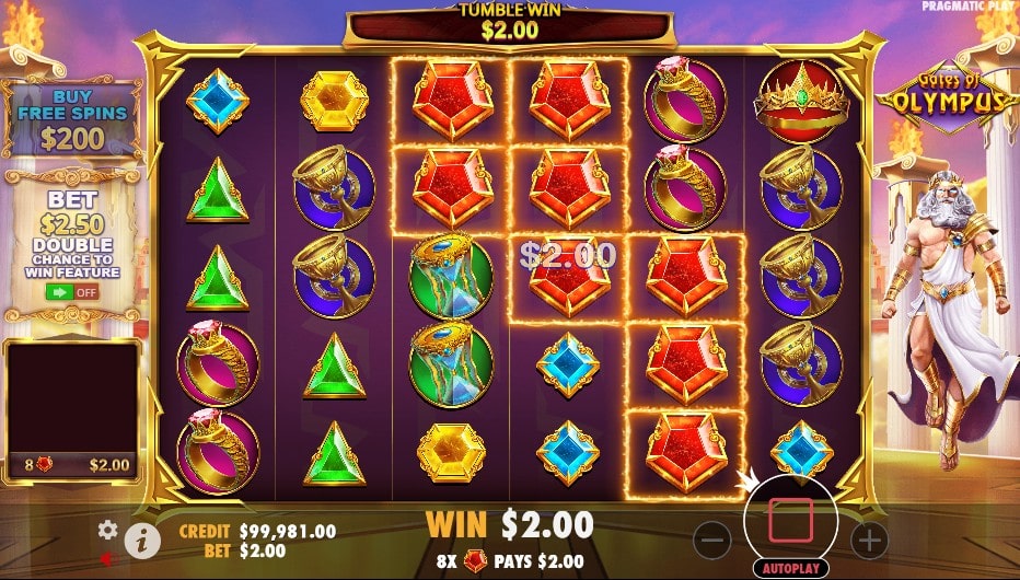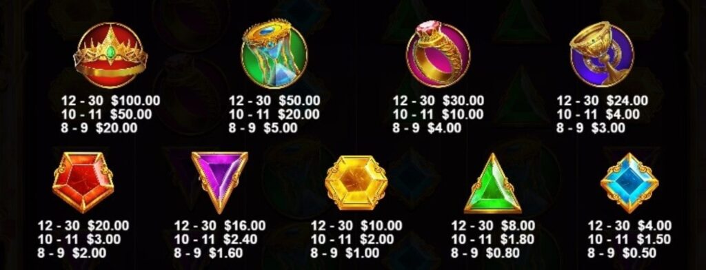 Le jeu présente huit symboles principaux représentés par des gemmes colorées. Les gemmes bleues, violettes et vertes constituent les symboles de faible valeur. Les gemmes rouges, roses et jaunes offrent des récompenses plus substantielles. Le symbole le plus lucratif est la couronne dorée. Elle peut rapporter jusqu’à 50 fois votre mise avec 12 symboles ou plus. Zeus lui-même apparaît comme symbole scatter, reconnaissable à sa barbe blanche et son aura électrique.