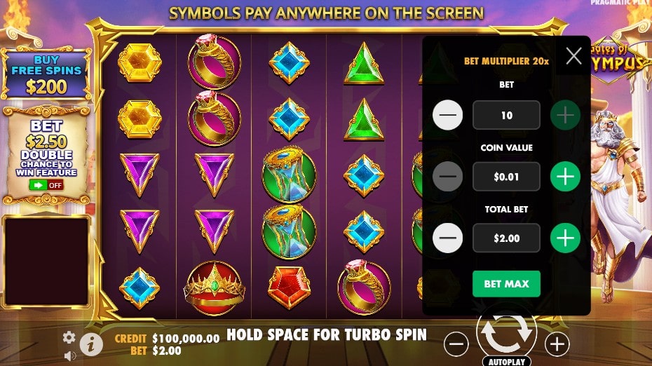 Avant de commencer votre aventure divine sur Gates Of Olympus, configurez d’abord votre mise. L’interface intuitive vous permet d’ajuster facilement votre mise totale. Utilisez les boutons « + » et « – » situés en bas de l’écran. Les mises commencent généralement à 0,20€ et peuvent atteindre 100€ par tour. Le panneau de contrôle comprend également un bouton d’autoplay pratique. Vous pouvez programmer jusqu’à 1000 tours automatiques avec différentes options d’arrêt personnalisables.
