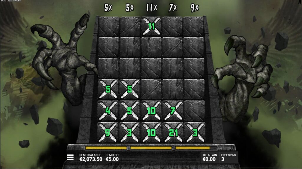 L’une des particularités de Hand of Anubis, c’est son système de multiplicateurs persistants. Dans le mode de base, chaque colonne peut contenir un multiplicateur « sombre » qui s’active lorsqu’un symbole spécial tombe. Ces multiplicateurs restent actifs et augmentent à chaque nouvelle cascade.