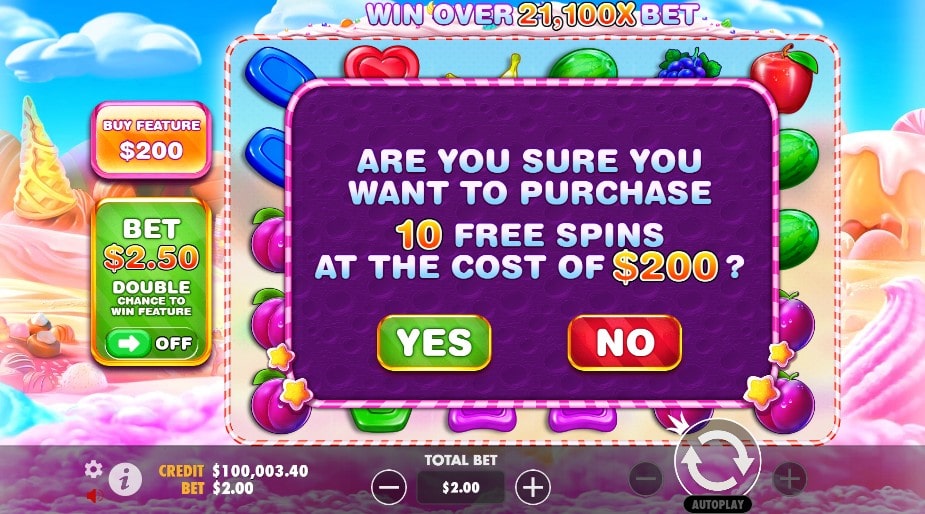 Si la patience n’est pas votre fort, Sweet Bonanza propose une fonction d’achat de bonus. Pour un coût de 100 fois votre mise de base, vous accédez directement à la fonctionnalité de tours gratuits sans attendre d’obtenir les 4 scatters nécessaires.