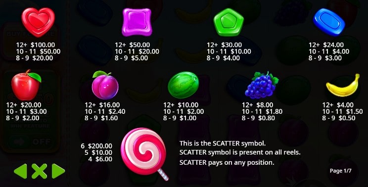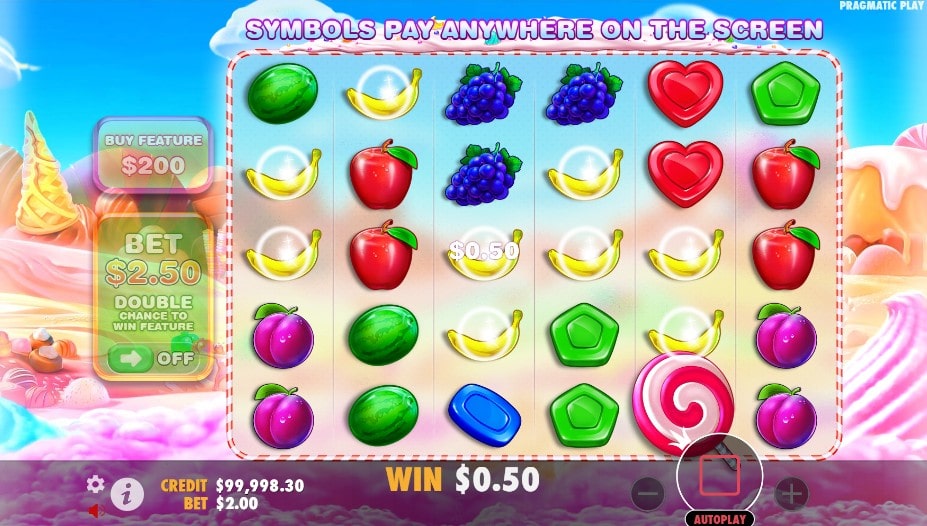 Le symbole le plus précieux est le bonbon en forme de cœur rouge, qui peut rapporter jusqu’à 50 fois votre mise pour 12 symboles ou plus. Le scatter, représenté par une sucette multicolore, est la clé pour débloquer les tours gratuitset augmenter vos gains.