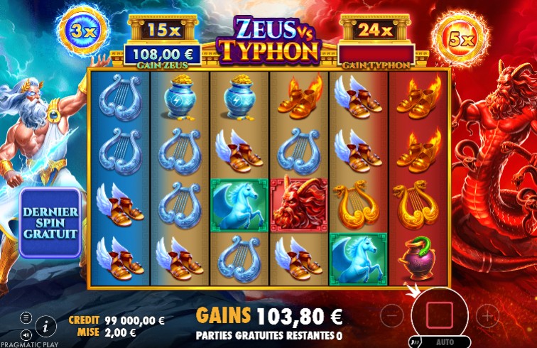 Zeus vs Typhon est une machine à sous en ligne développée par Pragmatic Play, sortie le 24 novembre 2025. Inspiré des combats mythologiques entre dieux et monstres, ce slot oppose Zeus, figure de l’ordre, à Typhon, incarnation du chaos.