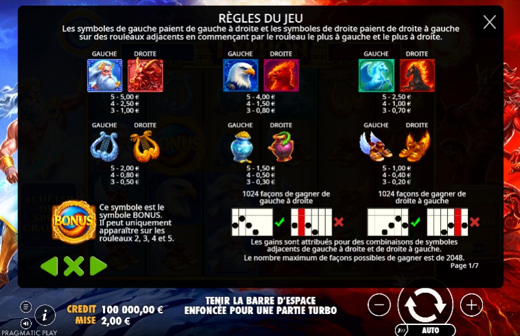 Dans ce slot, les gains peuvent venir de gauche à droite (symboles Zeus) et de droite à gauche (symboles Typhon), sur des rouleaux adjacents.
