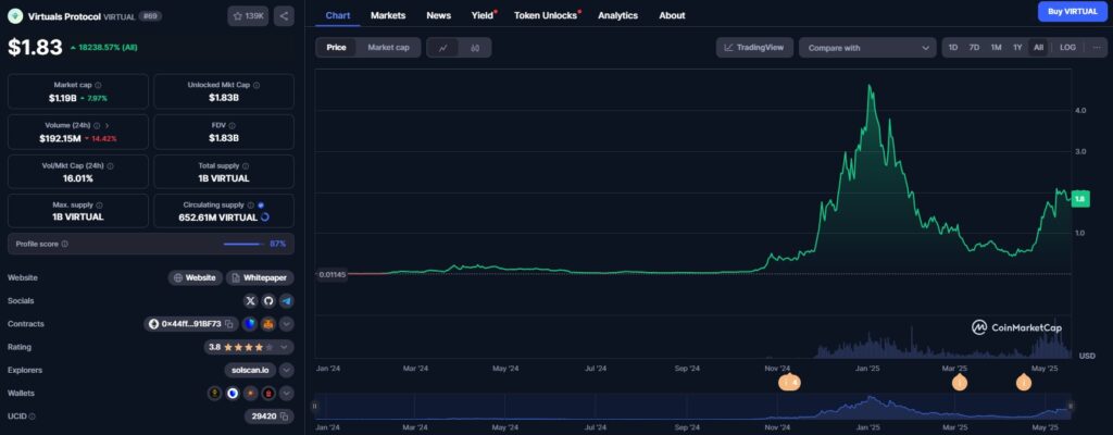Plus récemment, en mai 2025, Virtuals Protocol a procédé à une mise à jour de son Genesis launchpad. Cette mise à jour a introduit des fonctionnalités importantes. On retrouve notamment la transparence sur le vesting des tokens et les points d’agent stakés (staked agent points). Selon Messari et d’autres observateurs du marché, cette annonce a été suivie d’une hausse notable du prix du token VIRTUAL. Cela illustre la sensibilité du marché aux développements concrets du protocole.
